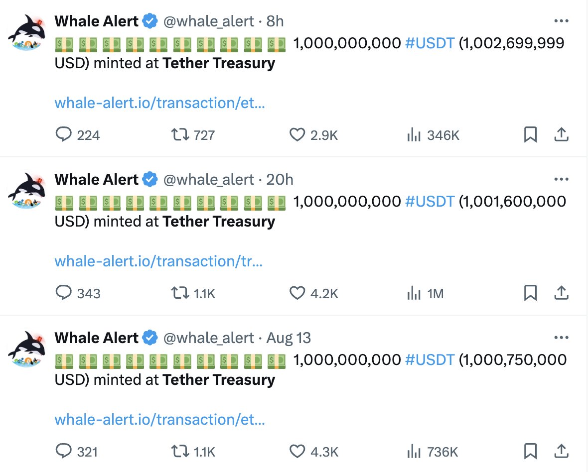เมื่อวันที่ 21 สิงหาคมที่ผ่านมา Look On Chain บริษัทวิเคราะห์และรวบรวมข้อมูล On-Chian เพื่อติดตามความเคลื่อนไหวของตลาดคริปโต ที่มีผู้ติดตามกว่า 400,000 รายบน X ได้เผยข้อมูลการผลิต USDT ของบริษัท Tether Treasury มูลค่า 3 พันล้านดอลลาร์ โดยแบ่งเป็น 3 ครั้ง ผลิตครั้งละ 1 พันล้านดอลลาร์ ครั้งแรกในวันที่ 13 สิงหาคม ครั้งที่ 2 และ 3 ในวันที่ 20 สิงหาคม
