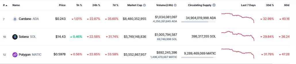 ส่งผลให้ราคาของ ADA, SOL และ MATIC ดิ่งหนักกว่า 20% ภายใน 24 ชั่วโมงที่ผ่านมา